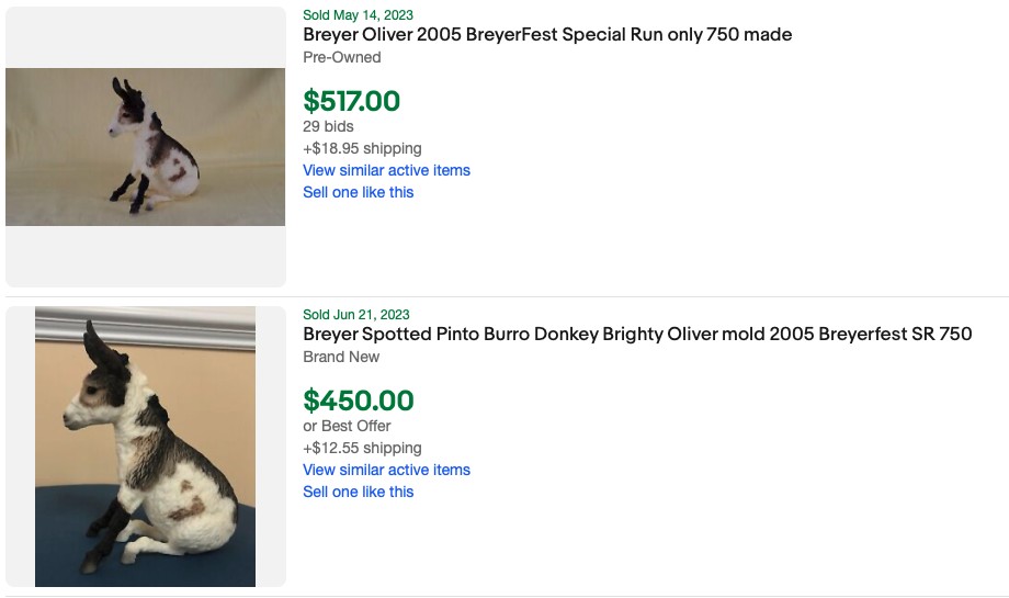 In the Breyer Value Guide, I do not publish speculation but do my best to report the resale values as they are. And try to keep up with the fluctuations. I have been adding eBay sold auction values to some of the rarer model listings. It is a slow process, but as I am recording these values, I am posting a screenshot of the ended listings with their price, and the date of sale. You can see an example of what I am doing with Flamingo’s listing: https://www.breyervalueguide.com/valueguide/flamingo/